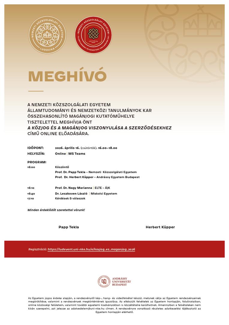 Az eseményre az alábbi linken lehet regisztrálni: https://ludevent.uni-nke.hu/e/kozjog_es_maganjog_2026